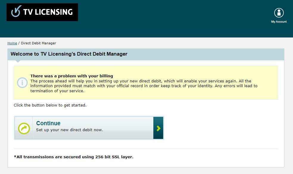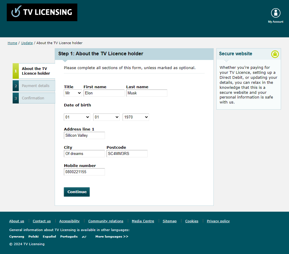 The wording in the yellow box is dodgy too, “enable your services”?? Not having a TV licence doesn’t stop any services from working, so this should raise some red flags at least! I pressed continue and filled the form out;