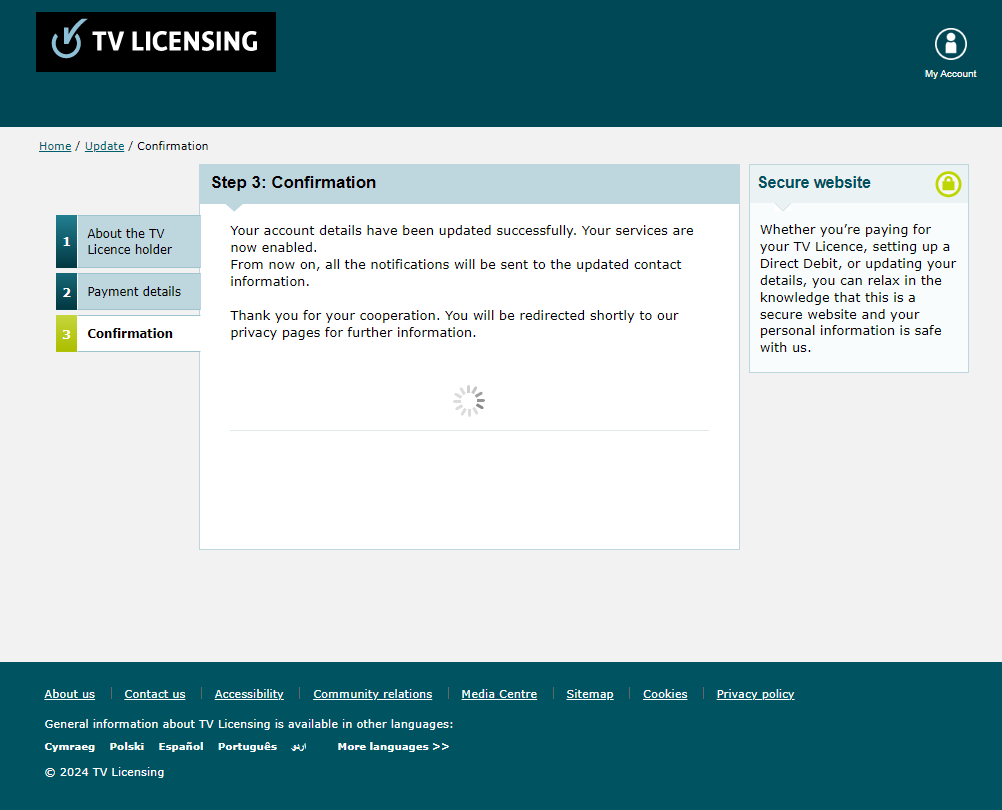 Confirmation page, then takes you to the OFFICIAL TV Licencing website, so that the victim thinks the whole thing has been official and correct.