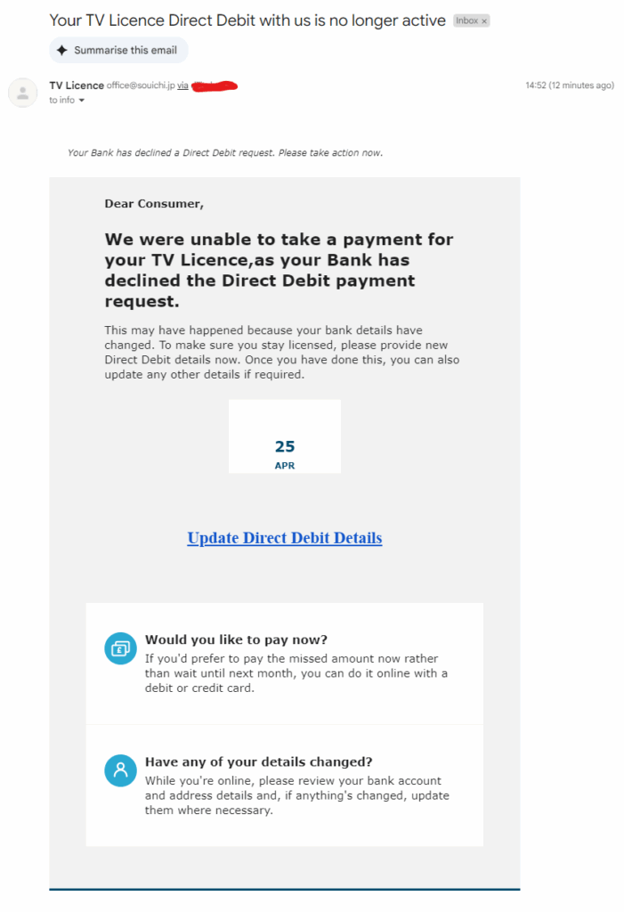 Firstly look at the sender email – the TV Licence folks wouldn’t send emails from souichi.jp!
