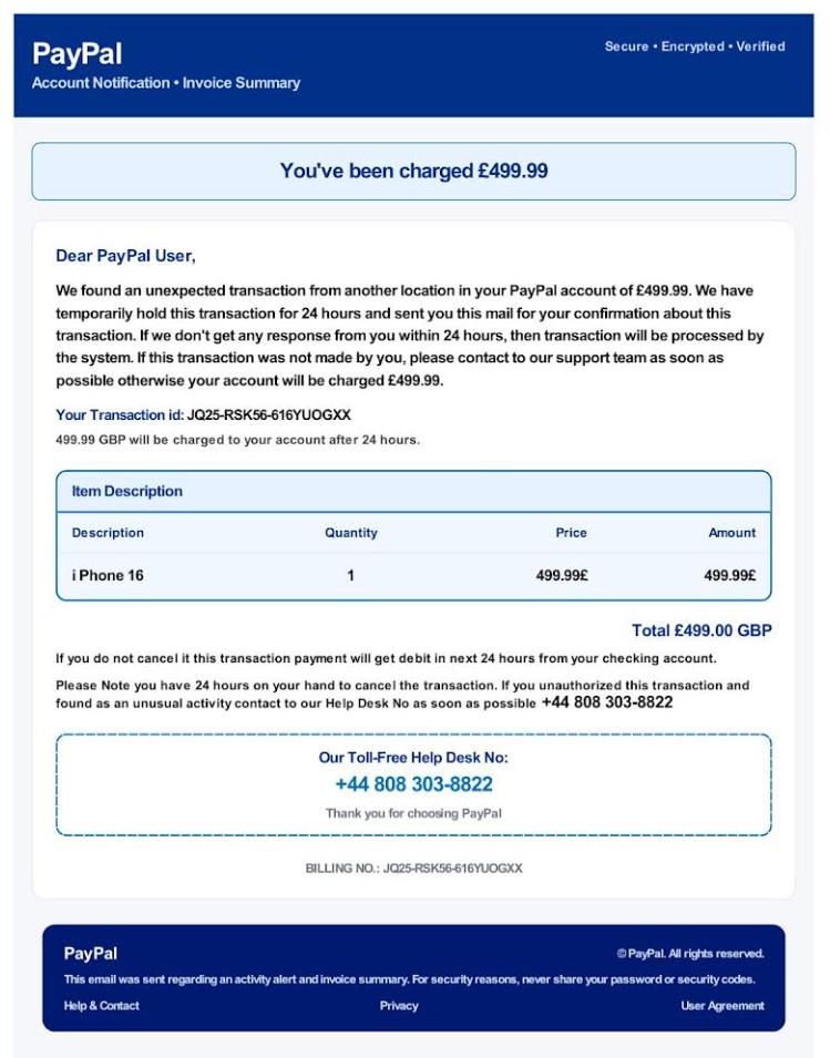 Hasnt come from an official PayPal email, the entire content is in an image attachment – so its clearly not legit.